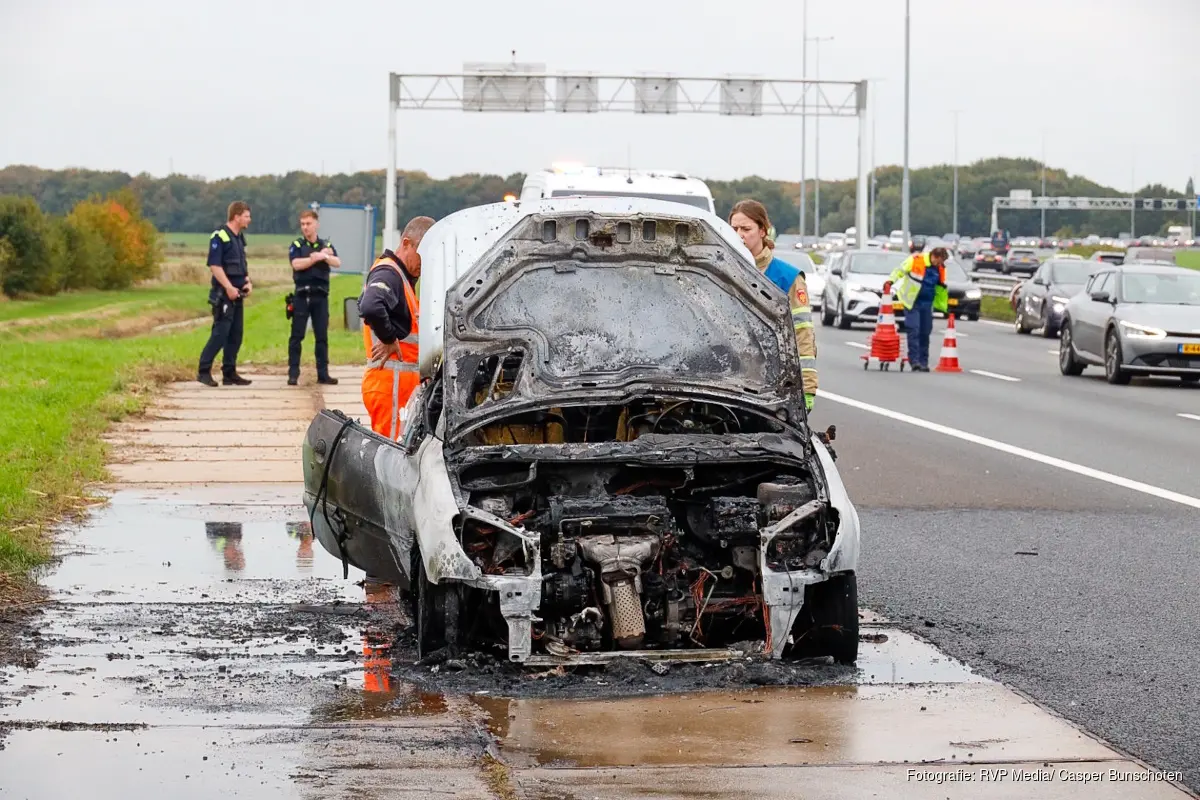 NAARDEN - Vrijdagmiddag rond 16:20 uur is de brandweer opgeroepen voor een autobrand op de A1 bij Naarden. Tijdens het rijden vloog het voertuig door nog onbekende oorzaak in brand.