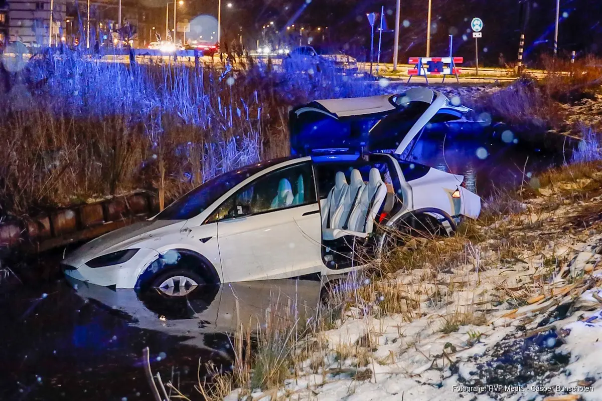 WEESP – Zaterdagavond rond 18.50 uur is een Tesla te water geraakt nadat het voertuig door gladheid uit de bocht vloog in Weesp.