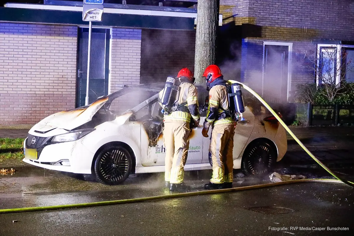 De auto stond bij aankomst van de brandweer aan de bovenkant volledig in brand. De elektrische deelauto is door de brand zwaar beschadigd geraakt.
