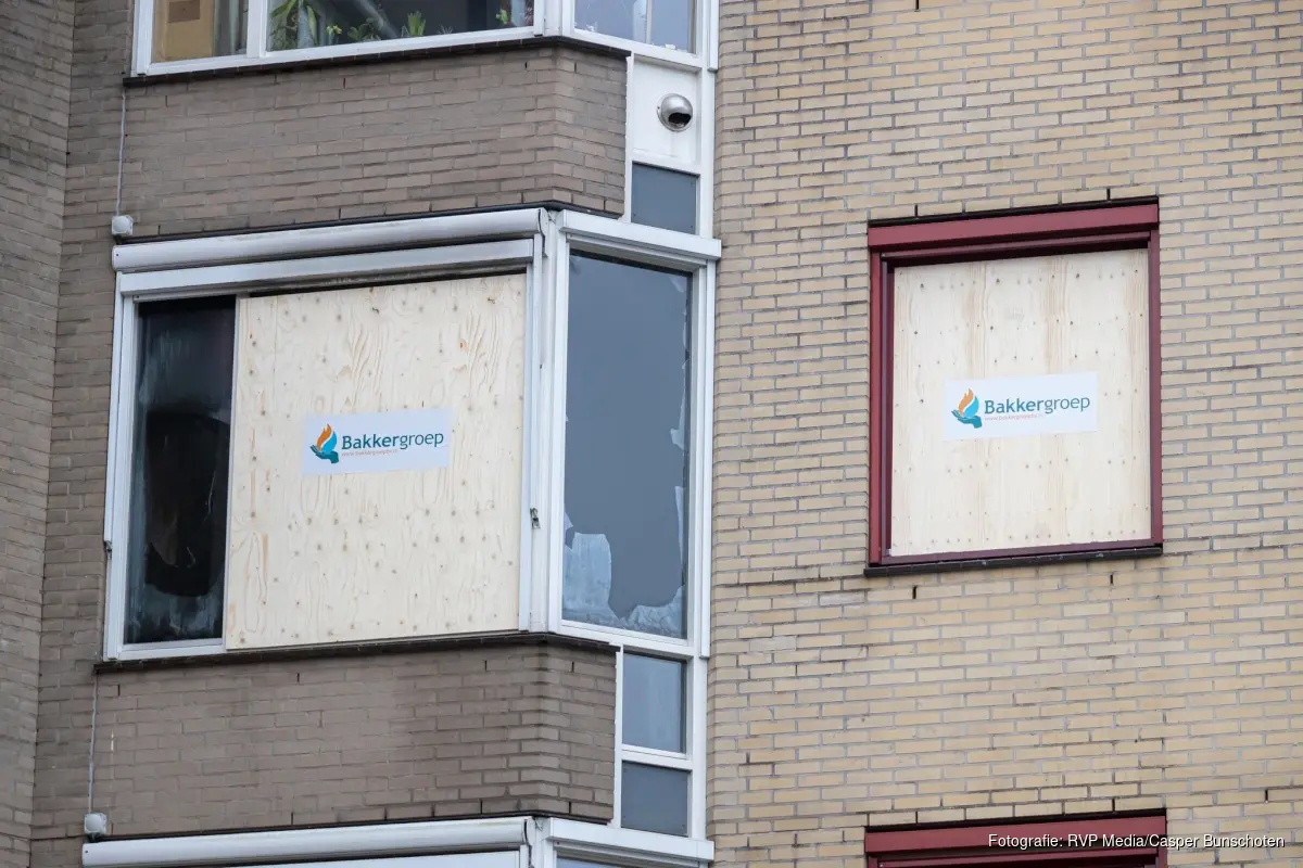 De ramen van het appartement zijn afgesloten met houten platen.
