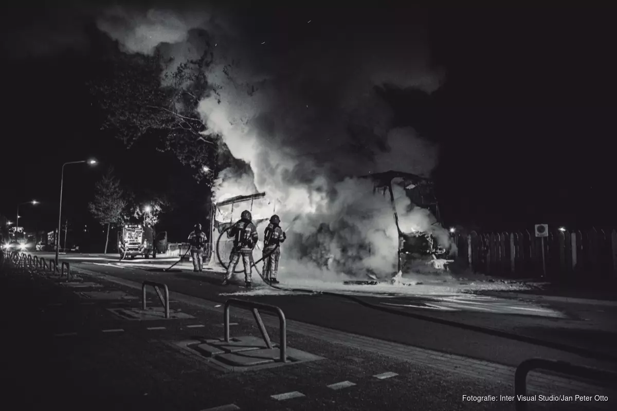 HILVERSUM - Even voor 04.30 uur zondagochtend kreeg de brandweer van Hilversum een melding van een brand in een gebouw aan de Anthony Fokkerweg. Bij aankomst ontdekten de brandweerlieden echter een fikse brand om de hoek. Op de Mussenstraat stond namelijk een geparkeerde touringcar volledig in brand. Het vuur was inmiddels ook al overgeslagen naar de boom waar de touringcar onder geparkeerd stond.