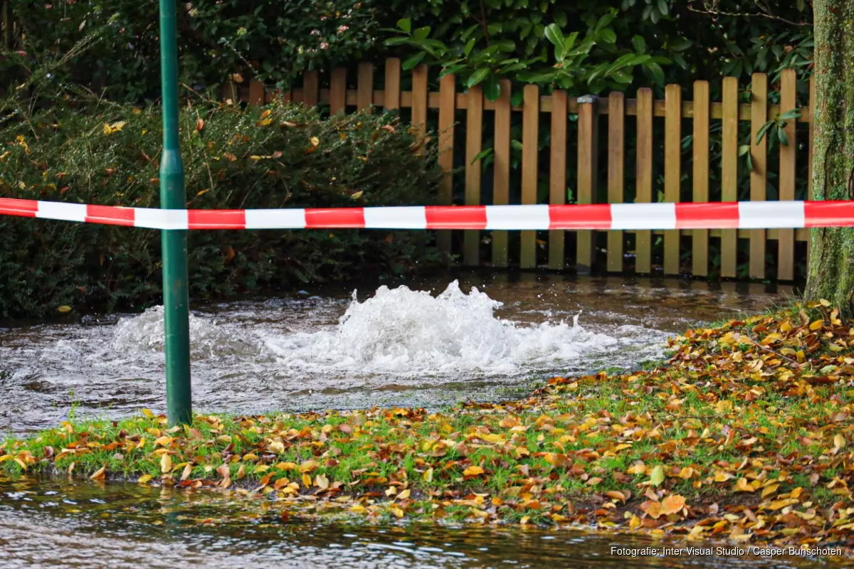 BLARICUM - Woensdag rond 11.30 uur liep de straat Rongen in Blaricum vol water. Ook de straten Kogge, Oosterhout en Schiemel is het een waterballet.