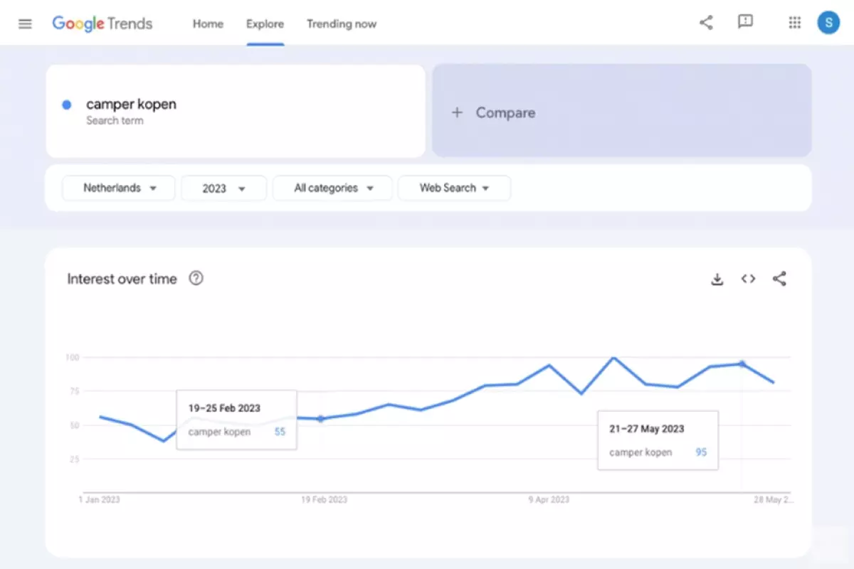 Eind februari 2023 was dit relatieve trendgetal nog 55. Eind mei 2023 zien we dat dit al is toegenomen naar 95. Dit is een stijging in de zoekinteresse van wel 72.7% in slechts 3 maanden. Op basis van de data uit Google Trends van de afgelopen jaren is de verwachting dat de zoekinteresse zal blijven toenemen en zal pieken in augustus. In de warme maanden wordt er dus het meeste naar campers en caravans gezocht, en ervaren de dealers zoals Stam Caravans & Campers ook de drukste maanden met het hoogste aantal klanten.