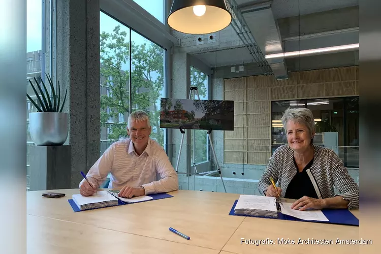HILVERSUM - 8 september jl. ondertekenden Jan van Barneveld, directeur bij de Alliantie Ontwikkeling en Antje de Groot-Schuttert, directeur bij Trebbe, de overeenkomst voor de ontwikkeling en realisatie van 9 eengezinswoningen en 25 appartementen aan de Lieven de Keylaan in Hilversum. Alle in het sociale huursegment.
