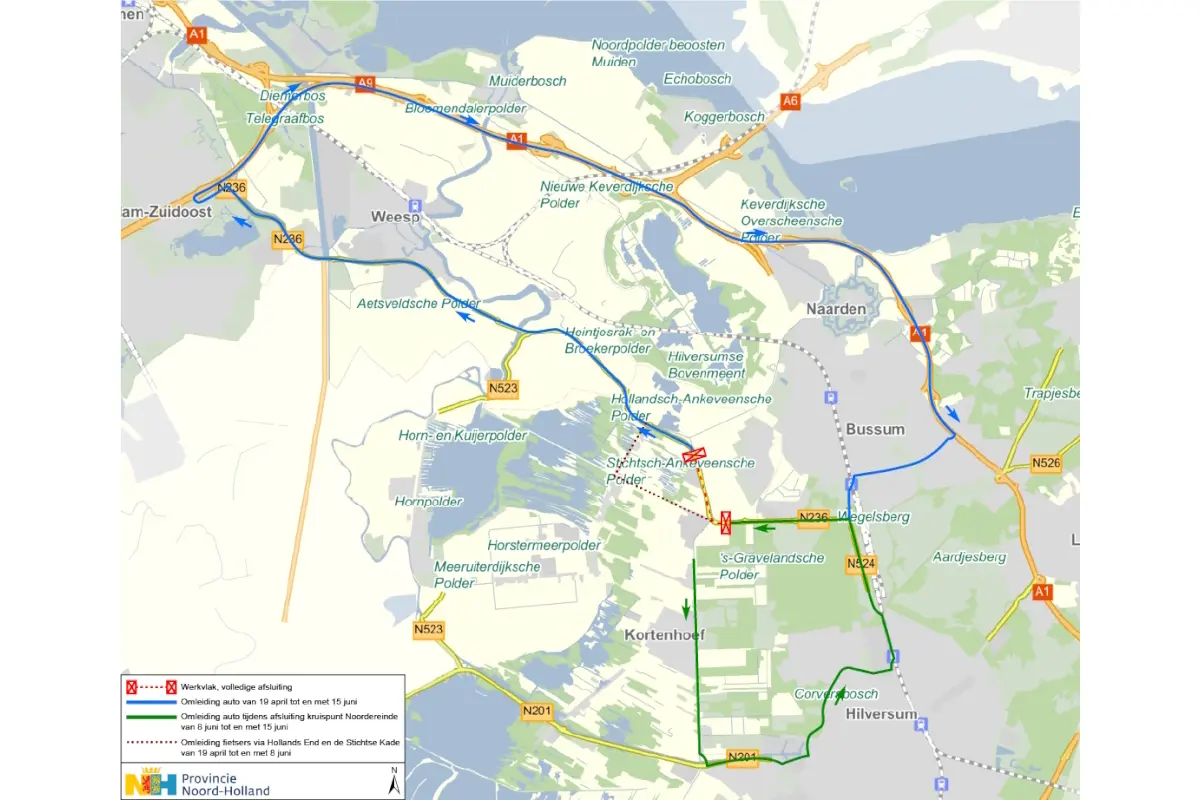 Tijdens de afsluiting wordt het autoverkeer omgeleid via de A1. Het verkeer moet rekening houden met 5 tot 10 minuten extra reistijd. Fietsers volgen een omleiding via Hollands End en de Stichtse Kade met enkele minuten extra reistijd tot gevolg. Tijdens de afsluiting van het kruispunt met Noordereinde van 8 juni tot en met 15 juni rijdt het autoverkeer van en naar Kortenhoef om via de N201 en de N524. De omleidingsroutes staan aangegeven met gele borden langs de weg en op onderstaande omleidingskaart.