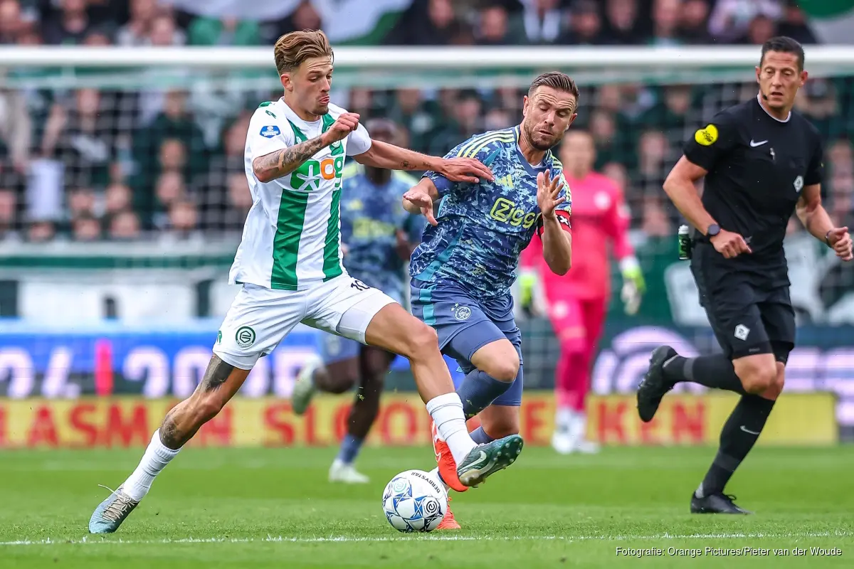 GRONINGEN - Ajax is één speelronde voor het einde van de competitie niet langer de koploper in de eredivisie. Door een tegendoelpunt in de 99ste minuut kwam de Amsterdammers bij FC Groningen niet verder dan 2-2. De ploeg van trainer Farioli heeft nu één punt achterstand op PSV dat zondag op bezoek bij Sparta de titel kan veilig stellen.